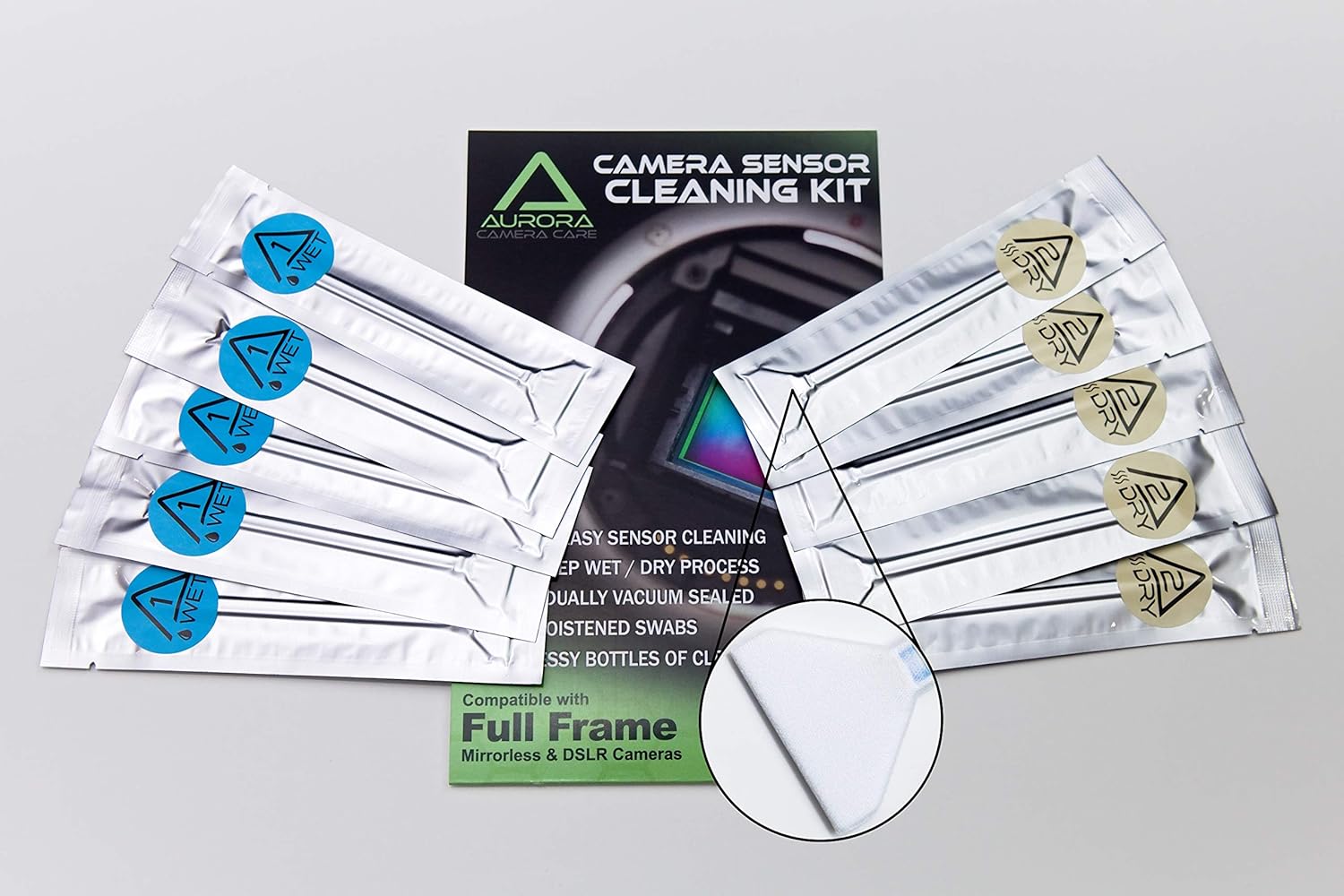 Includes 10 Ultra Soft Two-Ply Microfiber Cleaning Swab individually cleanroom vacuum sealed to be 100% dust and lint free. They come in 5 sets of (5) Pre-moistened Swabs with the exact amount of our specially formulated sensor safe cleaner and (5) Dry Swabs to around out our safe and easy two-step sensor cleaning process.
